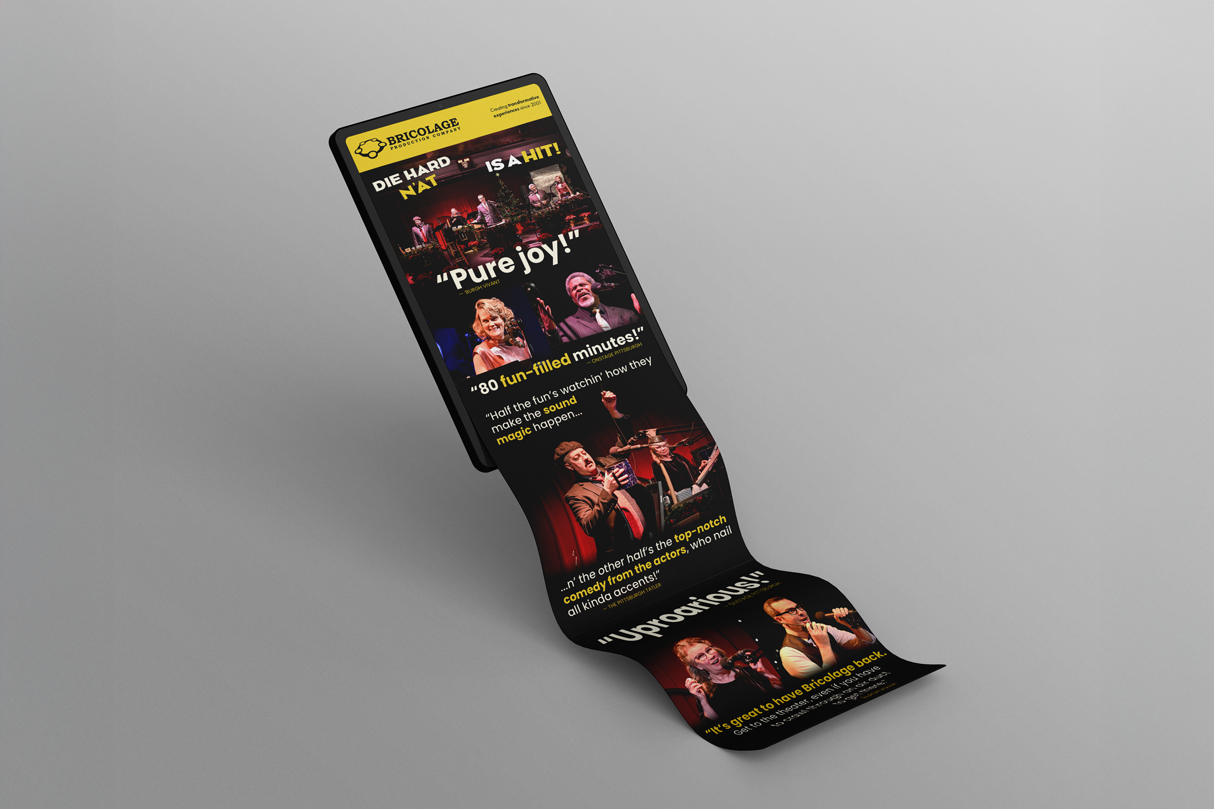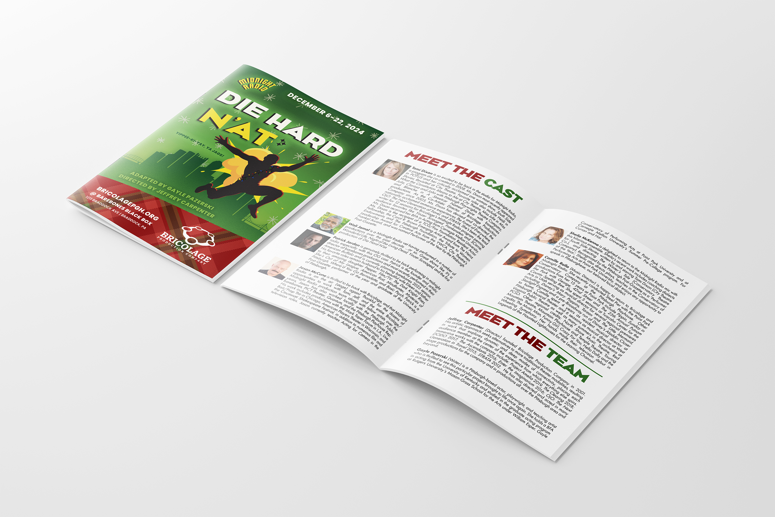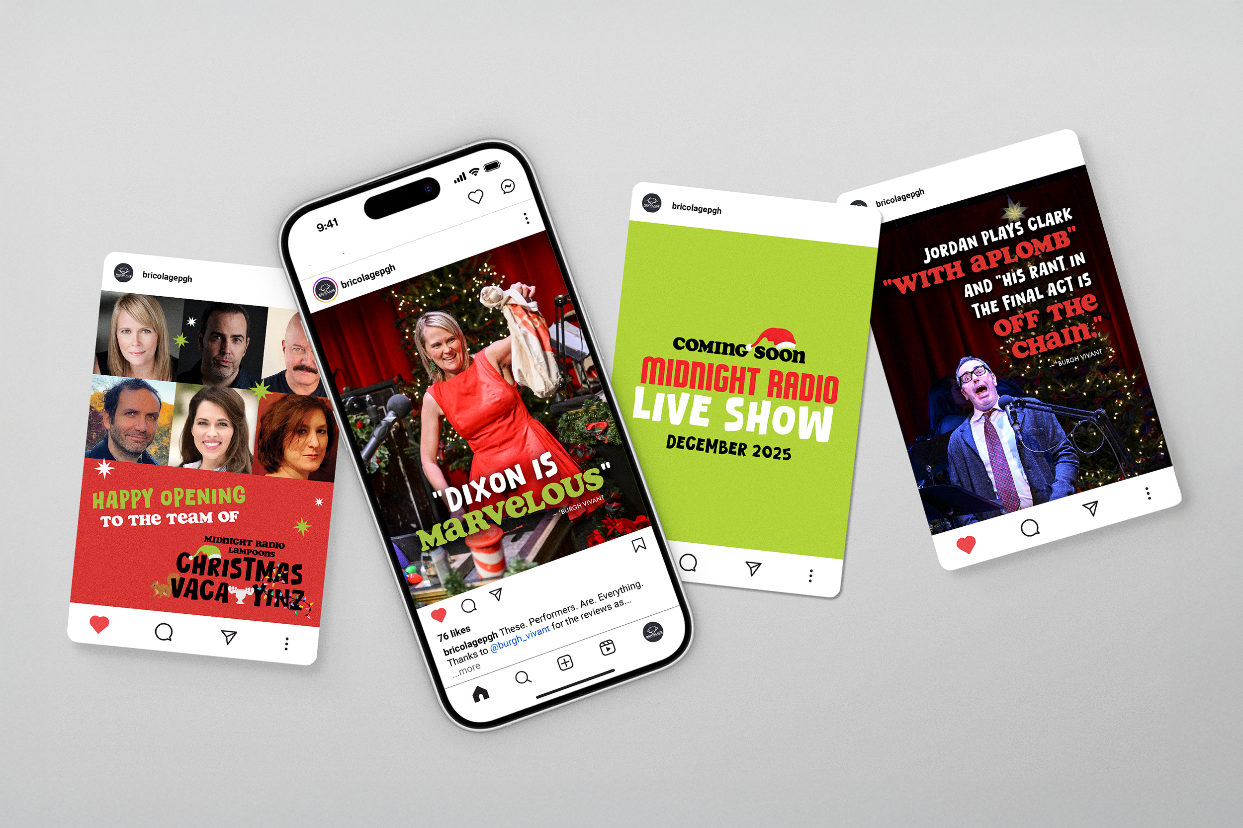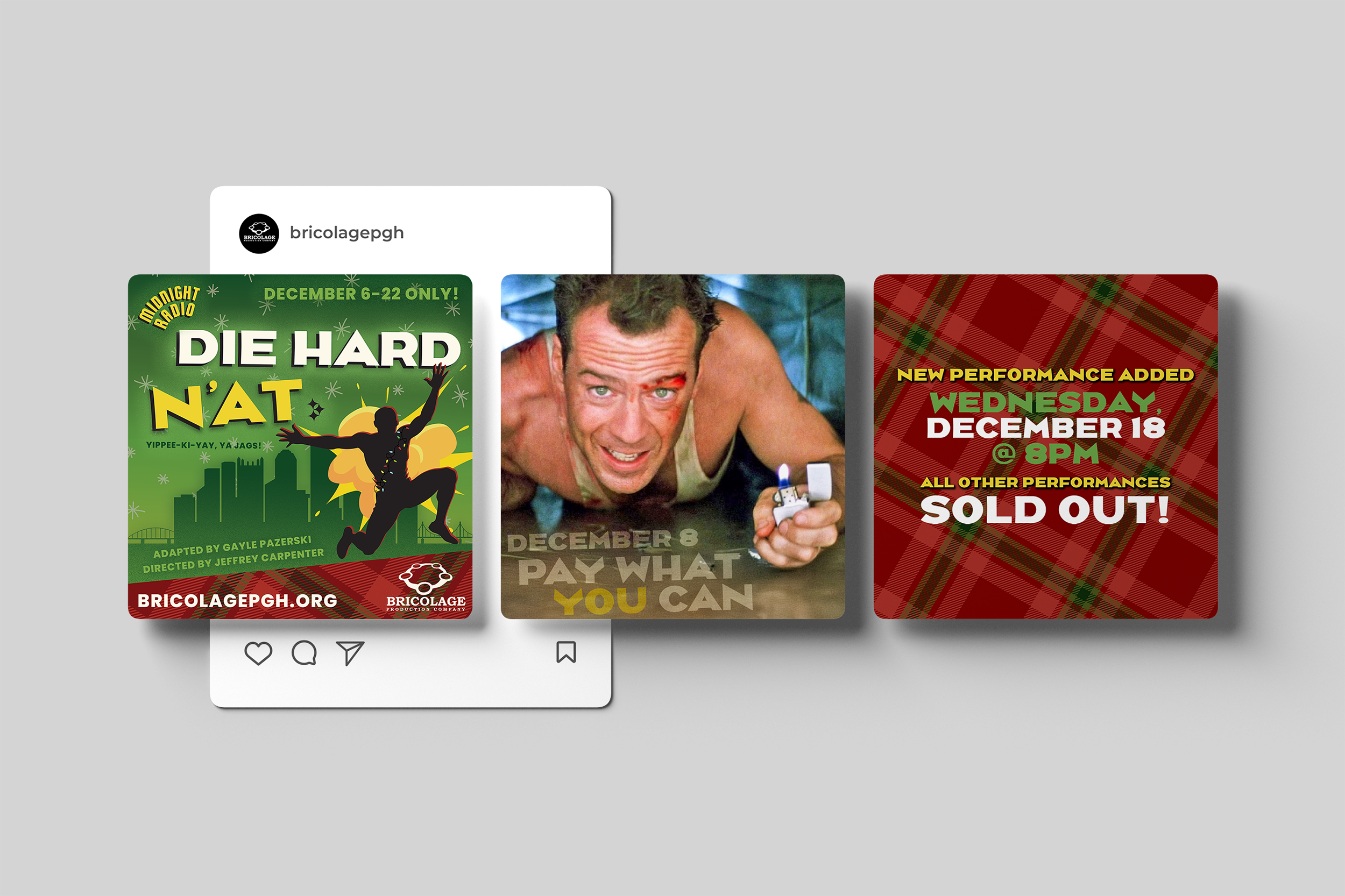 Bricolage's signature Midnight Radio Live programming holds a special place in Pittsburgh's cultural life: a living, breathing homage to 1940s radio broadcasts complete with Foley sound effects, live music, and a distinctly Steel City spin. When they returned to in-person performances with Die Hard N'at, I channeled the legacy of the programming into a campaign that honored it while reaching new audiences. The show sold out before opening. Their follow-up, Christmas Vacatyinz, did the same. Their audience was ready and waiting, and my work met that hunger with the clarity, personality, and creative intention it deserved.